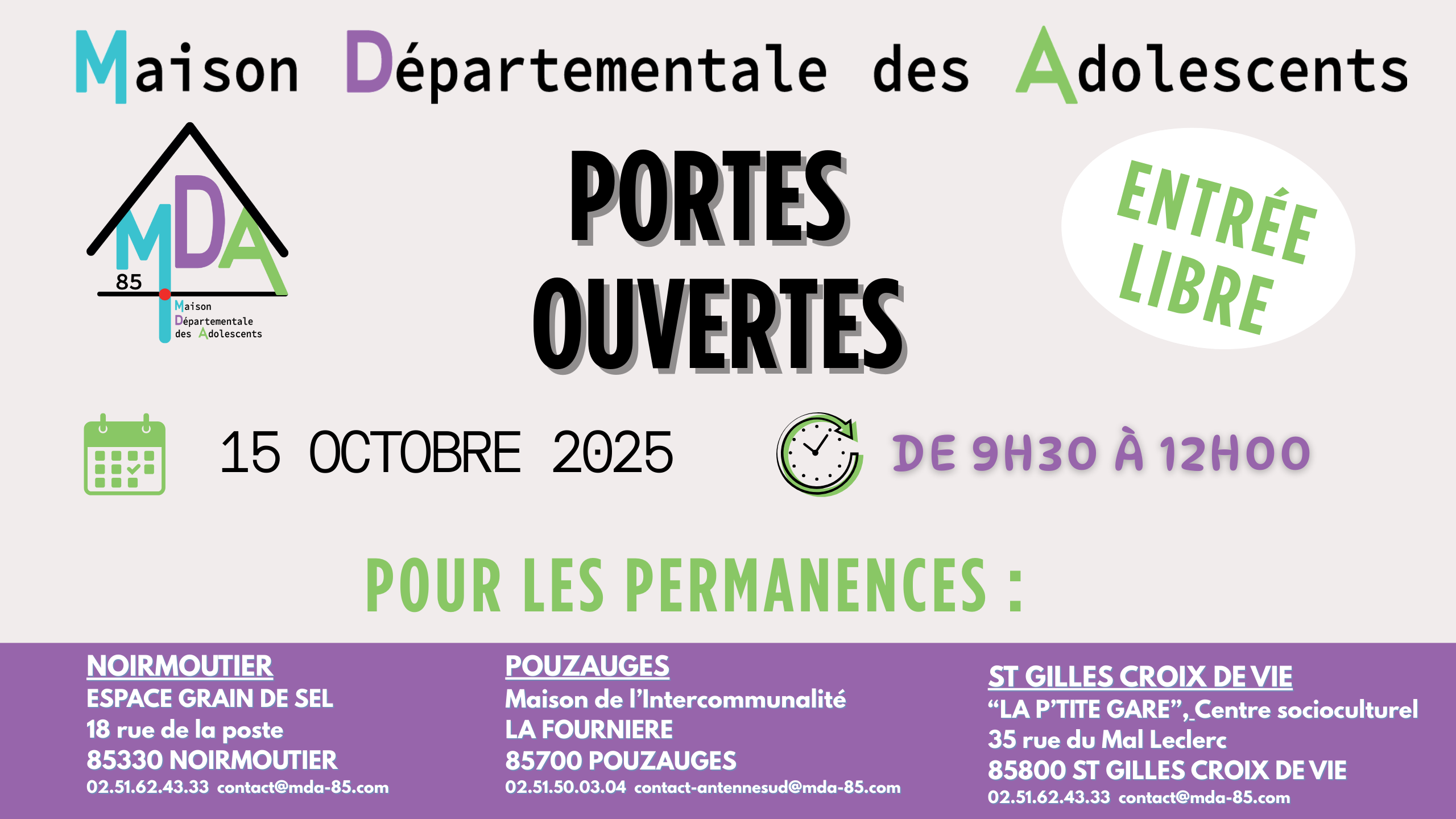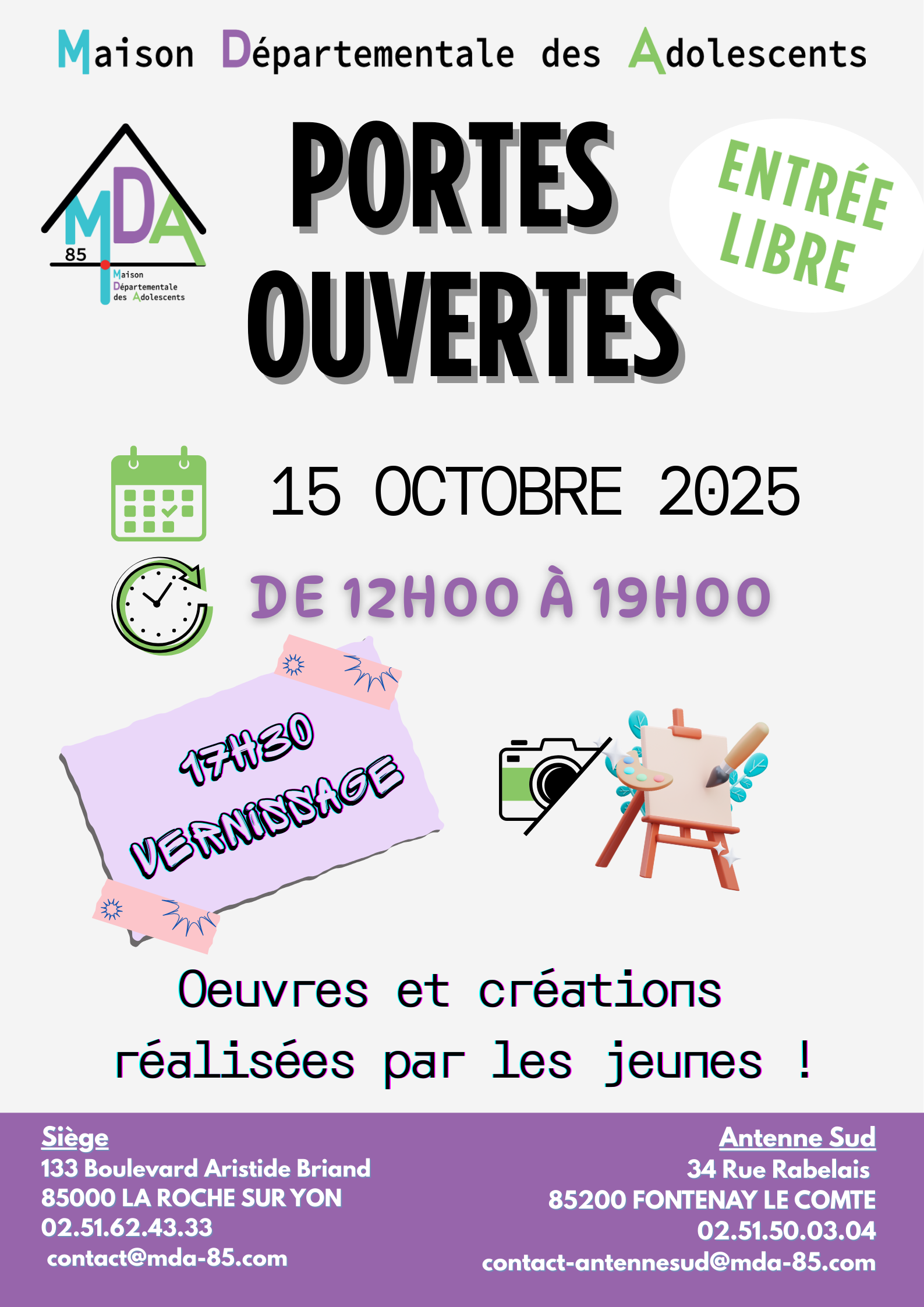 Les portes ouvertes se dérouleront de 12h à 19h au siège de la MDA au 133 Boulevard Aristide Briand à La Roche-sur-Yon ainsi qu’à l’Antenne Sud au 34 rue Rabelais à Fontenay-le-Comte.